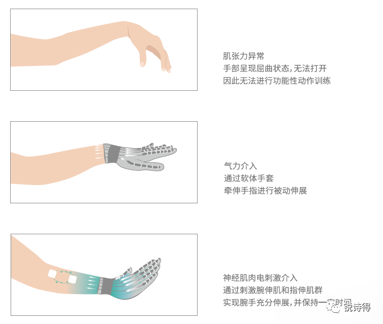 气电联合是将神经肌肉电刺激联合气动软体手套,通过智能算法控制介入顺序,同时进行手腕和手指牵伸,对手部高张力问题进行整体干预。