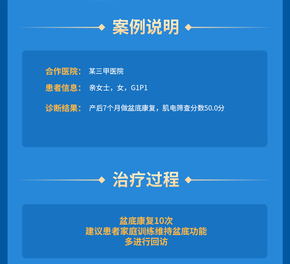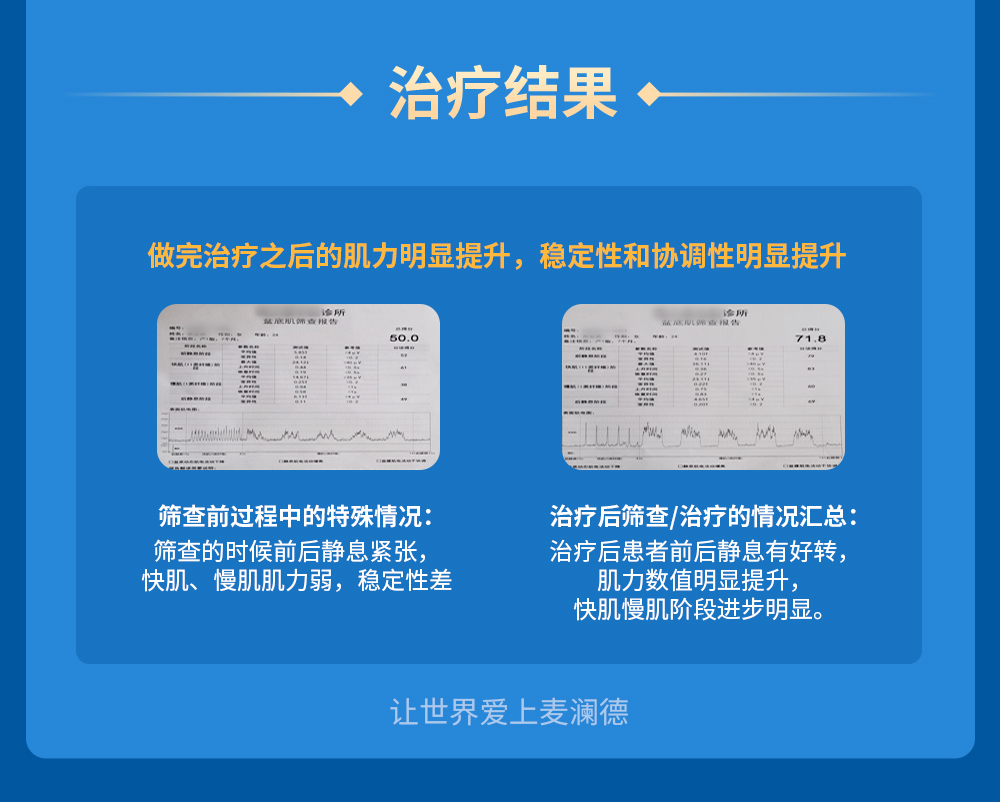 麦澜德盆腔脏器脱垂案例 徐女士,56岁,诊断脏器脱垂,第一次评估35.3 中间治疗依性性很高,隔天一次来院盆底肌治疗,有配合家庭kegel训练,经盆底肌治疗一个月,再次评估73.2 ,现已继续第二疗程治疗