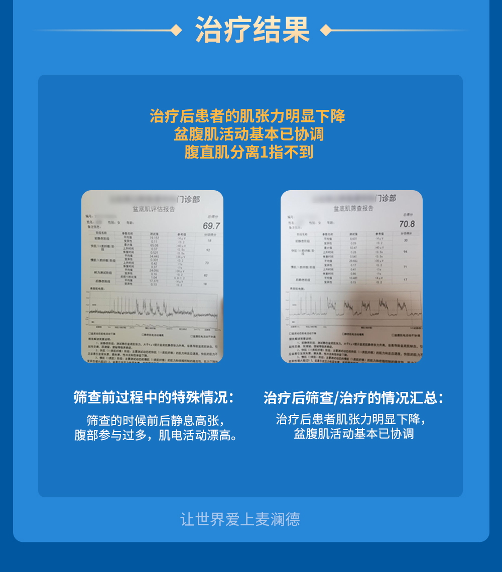 麦澜德盆腔脏器脱垂案例 徐女士,56岁,诊断脏器脱垂,第一次评估35.3 中间治疗依性性很高,隔天一次来院盆底肌治疗,有配合家庭kegel训练,经盆底肌治疗一个月,再次评估73.2 ,现已继续第二疗程治疗