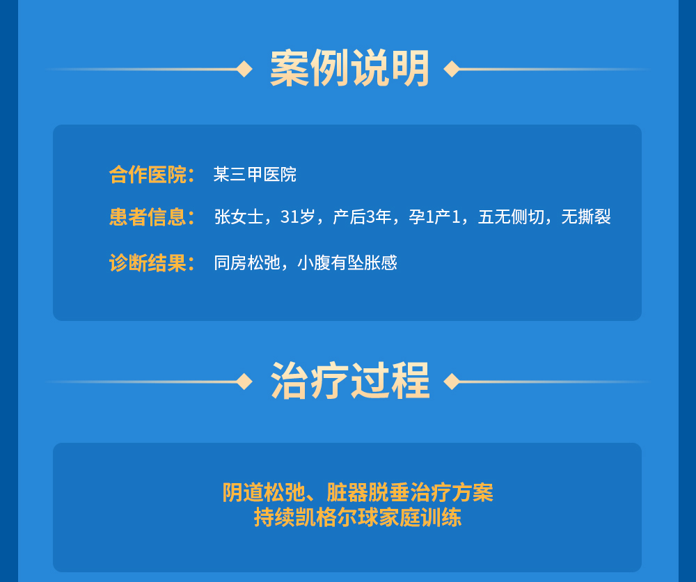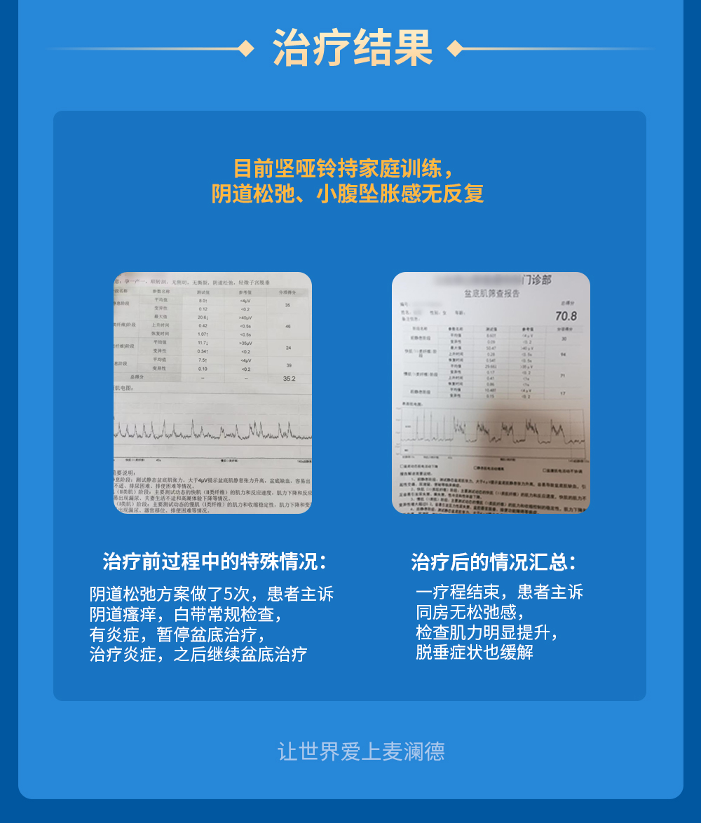 麦澜德盆腔脏器脱垂案例 徐女士,56岁,诊断脏器脱垂,第一次评估35.3 中间治疗依性性很高,隔天一次来院盆底肌治疗,有配合家庭kegel训练,经盆底肌治疗一个月,再次评估73.2 ,现已继续第二疗程治疗