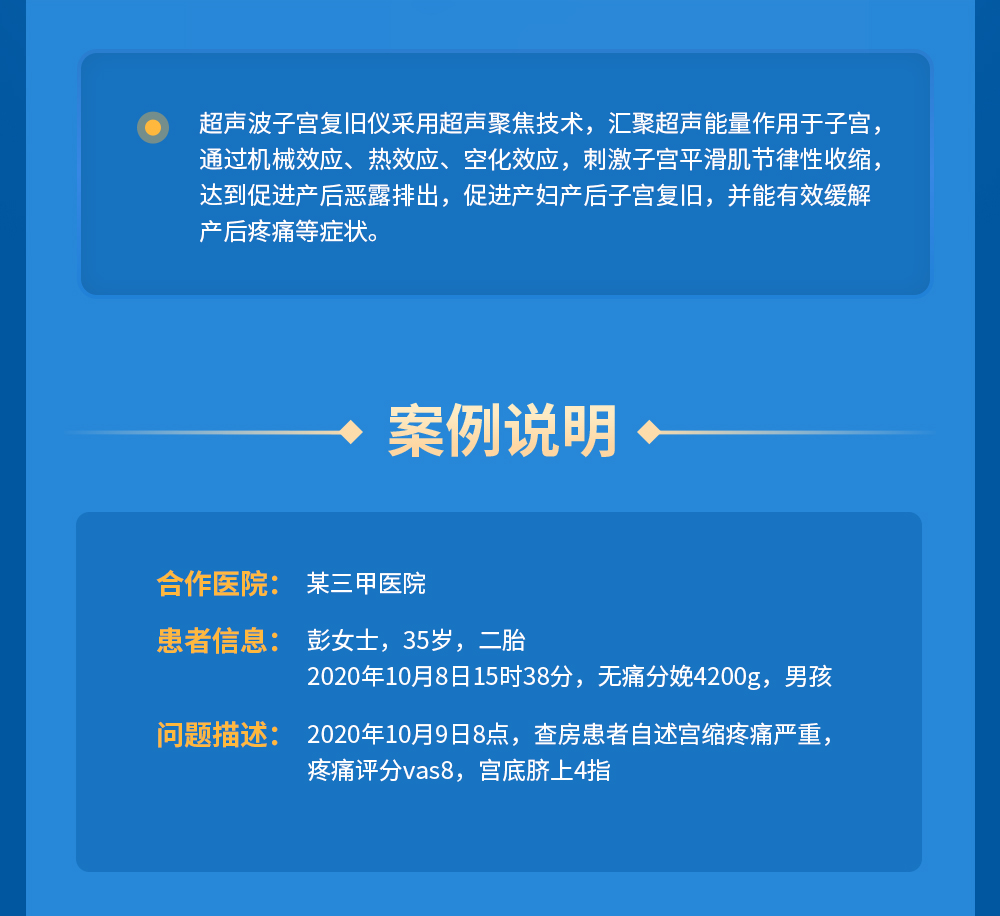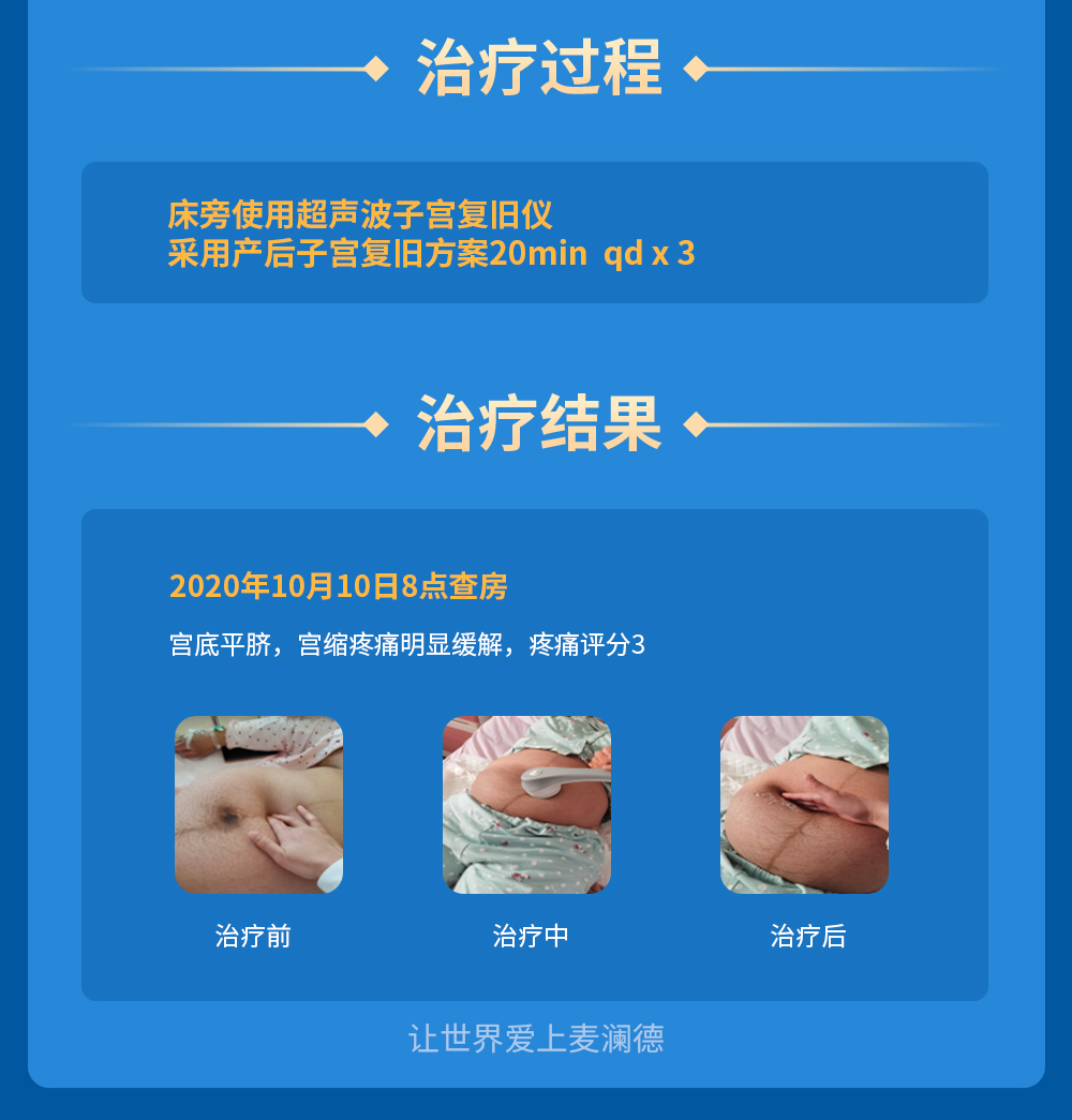 麦澜德子宫复旧案例 患者:彭女士 35 岁 主诉&治疗过程: 2020 年 10 月 8 日 15: 38 二胎无痛分娩 4200g 男孩 2020 年 10 月 9 日 8: 00 查房自述宫缩痛疼严重,疼痛评分 8,宫底脐上 4 指,床旁进行超声波子宫恢复恢复 15min qd×3 2020 年 10 月 10 日 8: 00 查房宫底平脐,宫缩痛疼明显缓解 ,疼痛评分 3