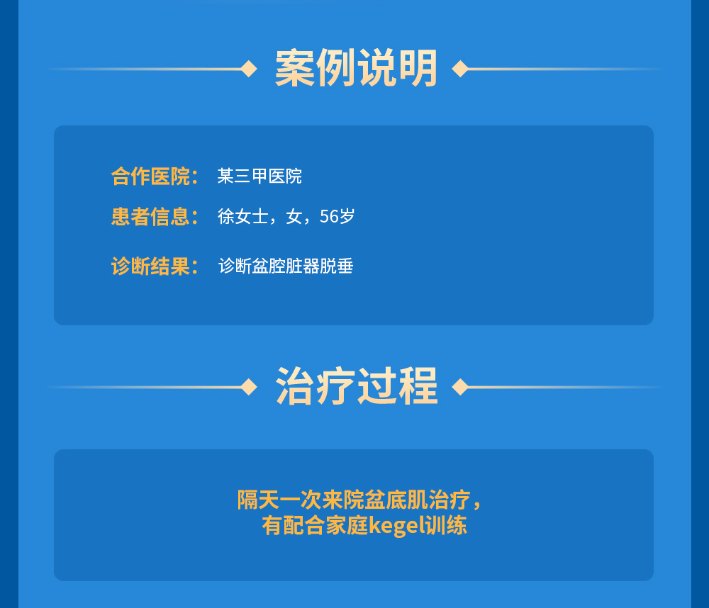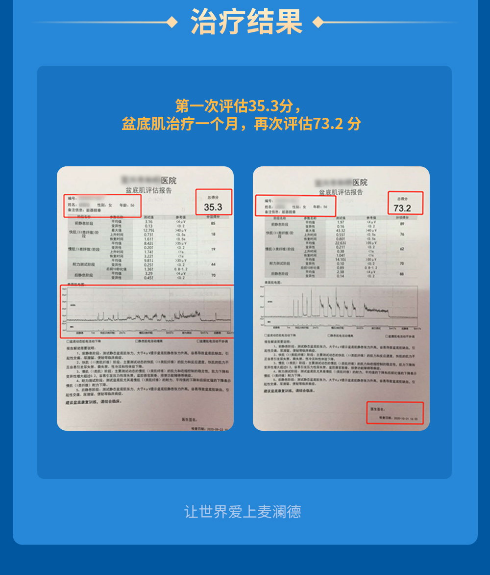 麦澜德盆腔脏器脱垂案例 徐女士,56岁,诊断脏器脱垂,第一次评估35.3 中间治疗依性性很高,隔天一次来院盆底肌治疗,有配合家庭kegel训练,经盆底肌治疗一个月,再次评估73.2 ,现已继续第二疗程治疗